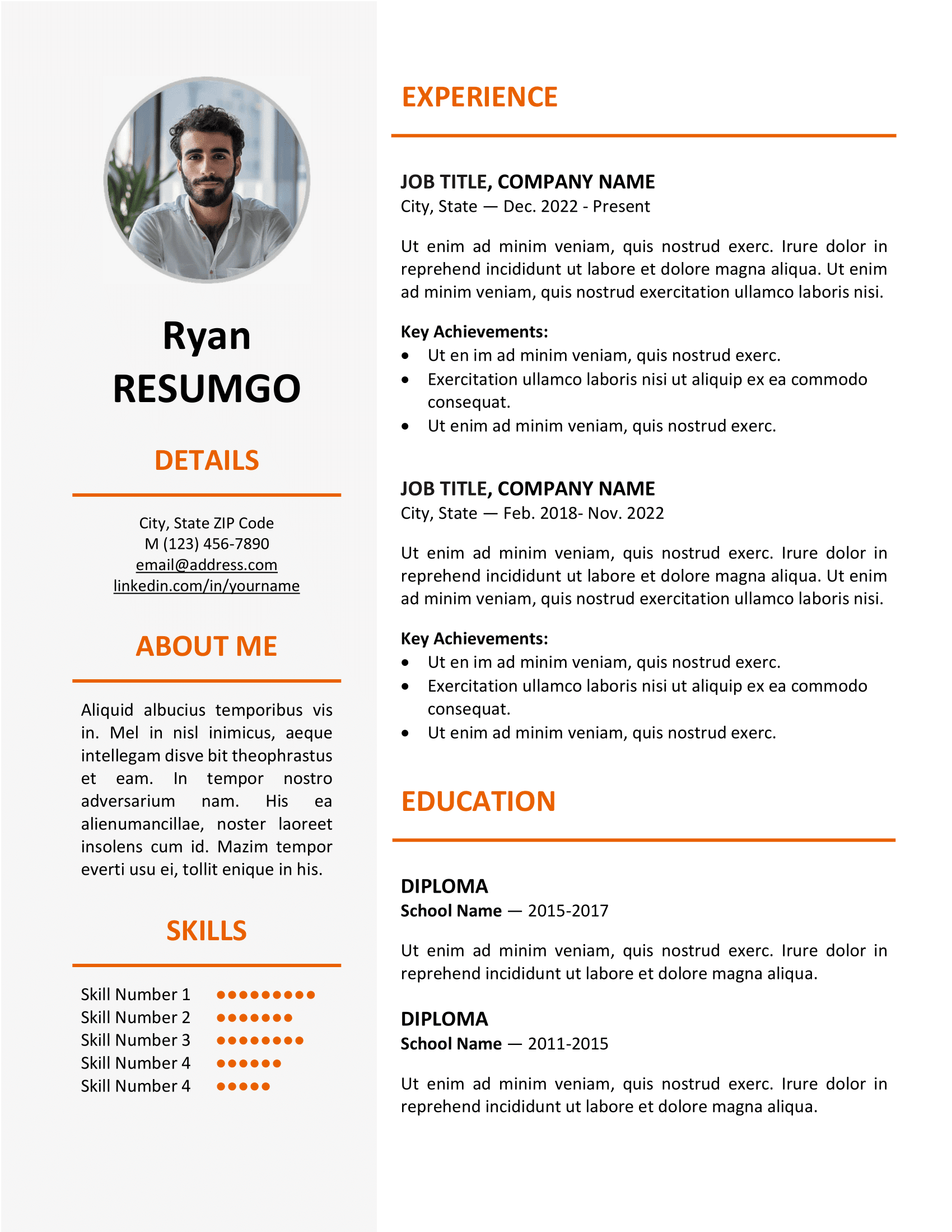 The Ikebukuro template comes with six attractive color versions: blue, gray, green, orange, purple, and red. It also includes an optional ID photo placeholder, giving you flexibility depending on regional hiring standards. Designed for US Letter size, the resume is print-ready and uses only free fonts for convenience.