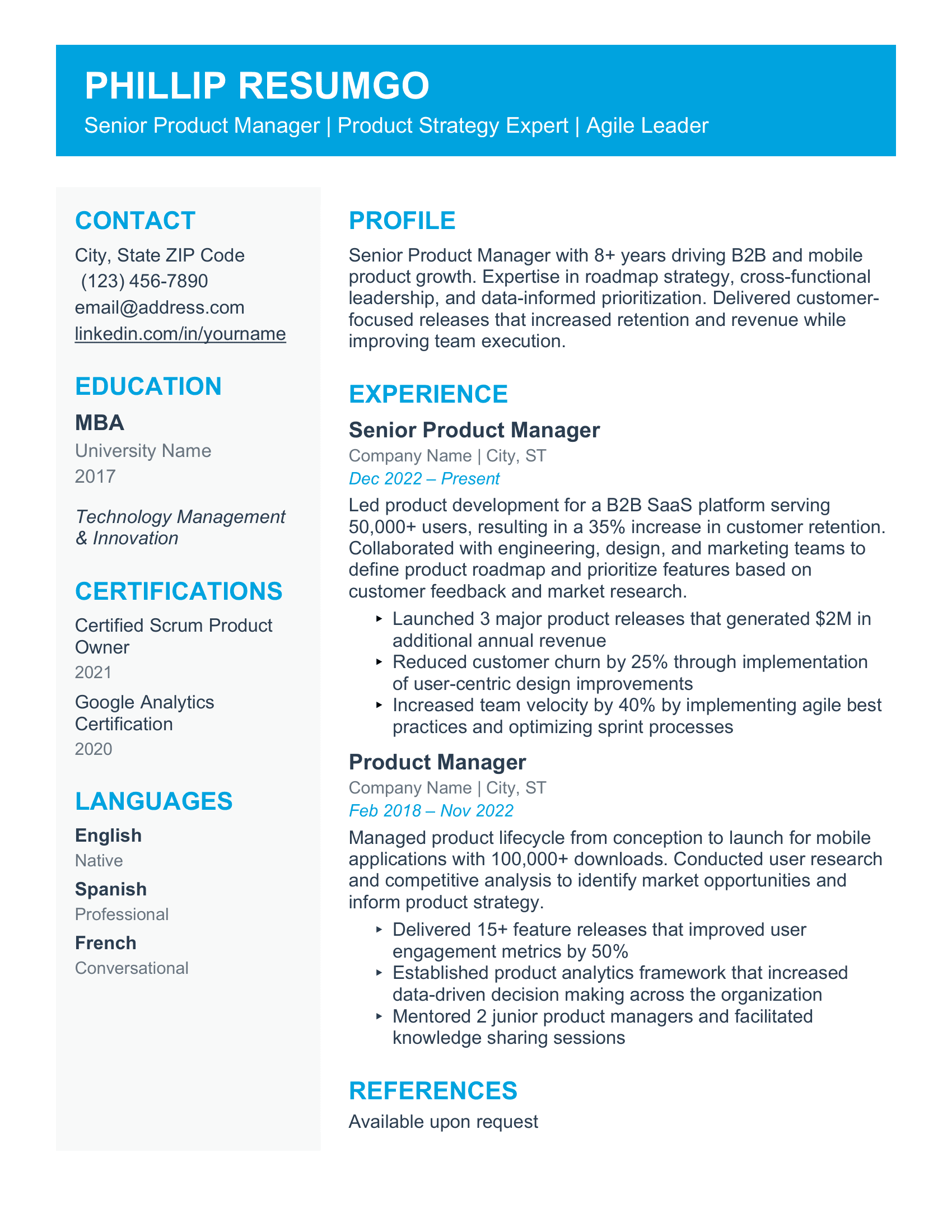 This template suits professionals in business, management, and technology fields. Because it avoids heavy graphics, it works with most applicant tracking systems. However, minor simplifications can optimize ATS compatibility further. Microsoft Word and Google Docs formats allow quick customization and easy updates.