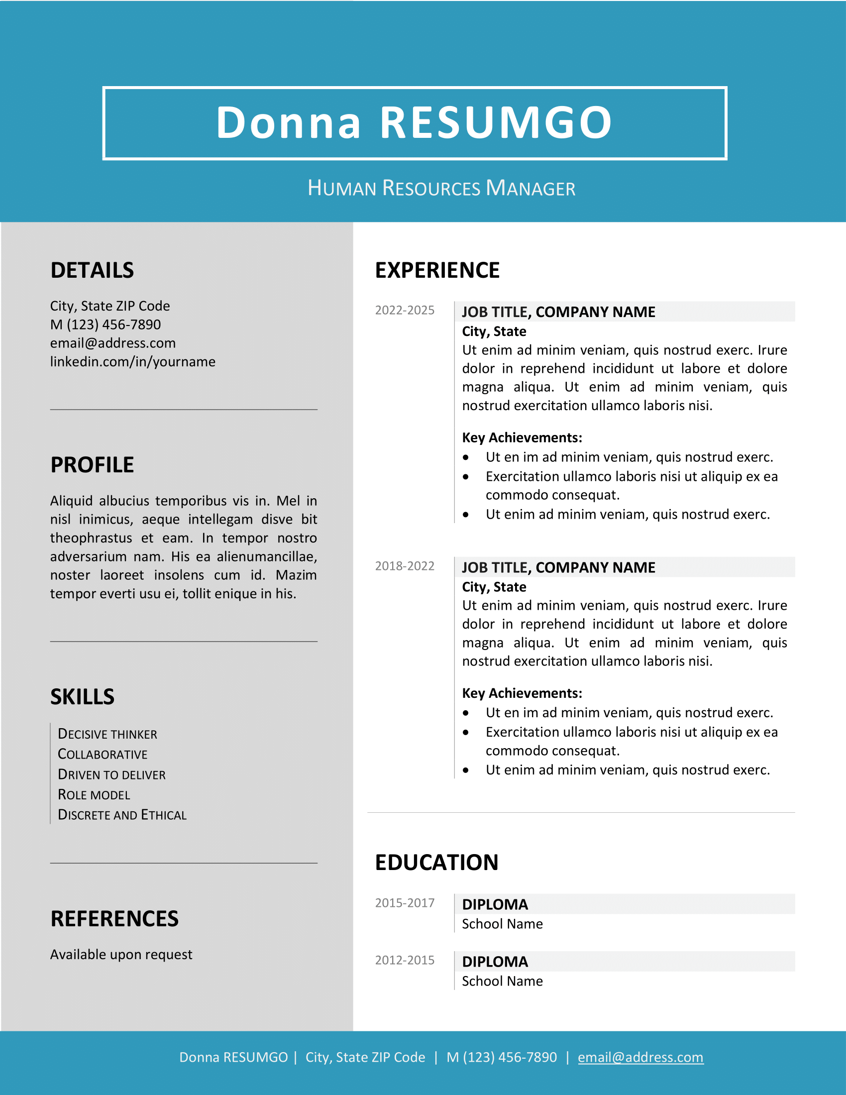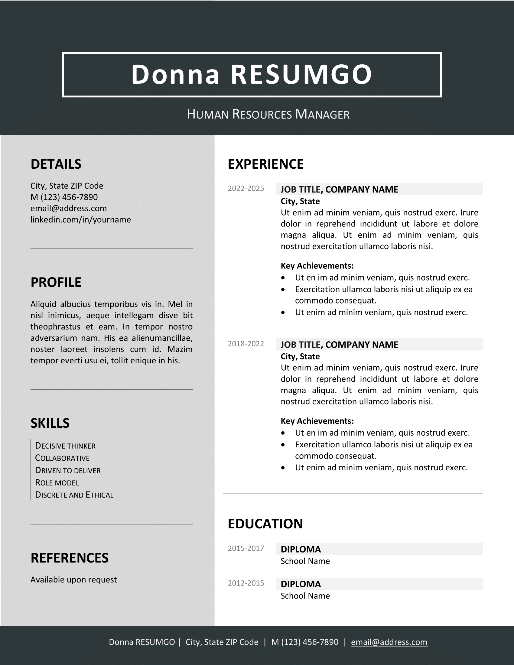 The Jordaan resume template is a polished and professional design built for candidates who value clarity and simplicity. With its two-column layout, clean typography, and a distinctive header and footer, it offers a modern yet approachable format that works well across industries.