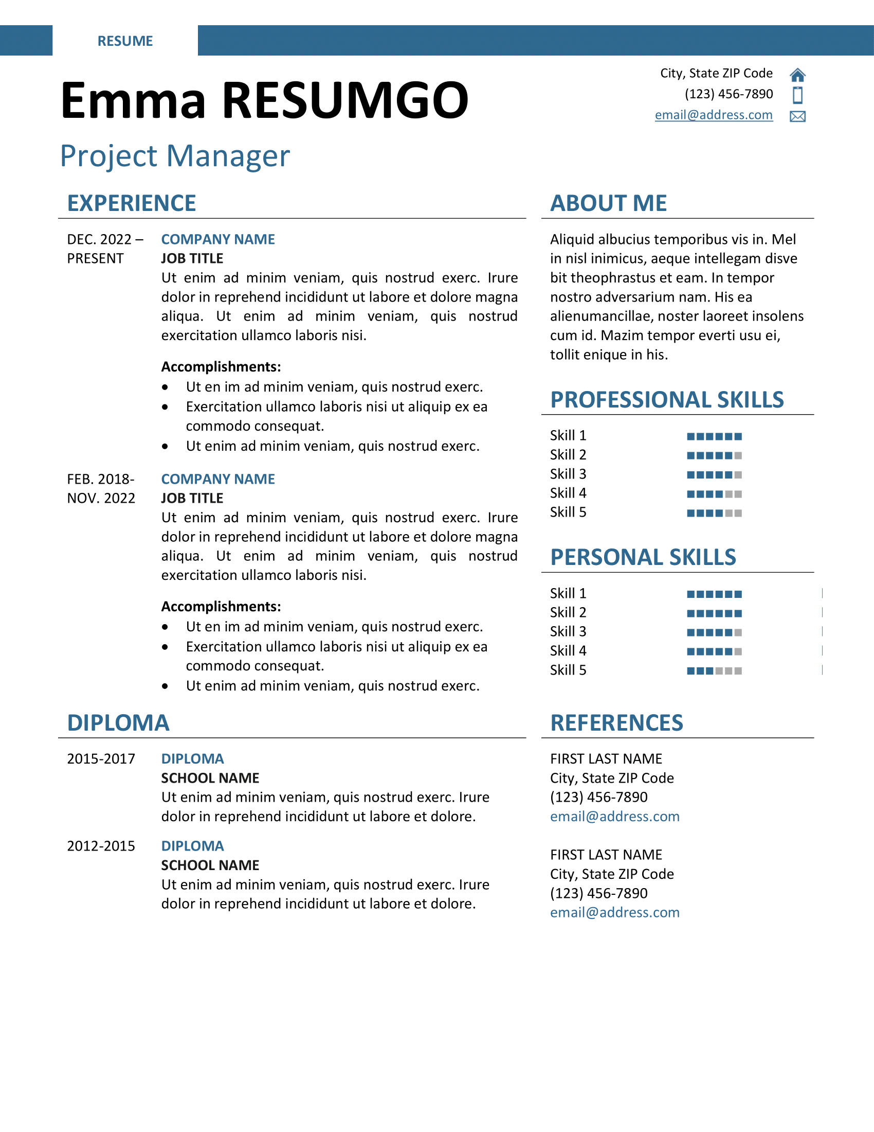 Montjuic is a clean and simple resume template designed to make a strong impression without unnecessary distractions. With its clear two-column layout and a bold colored banner across the top, it creates a professional structure that highlights your experience and skills while maintaining an elegant, modern look.