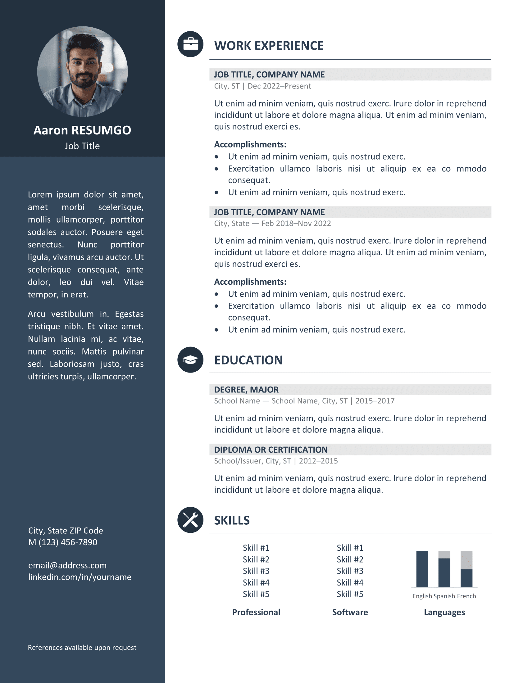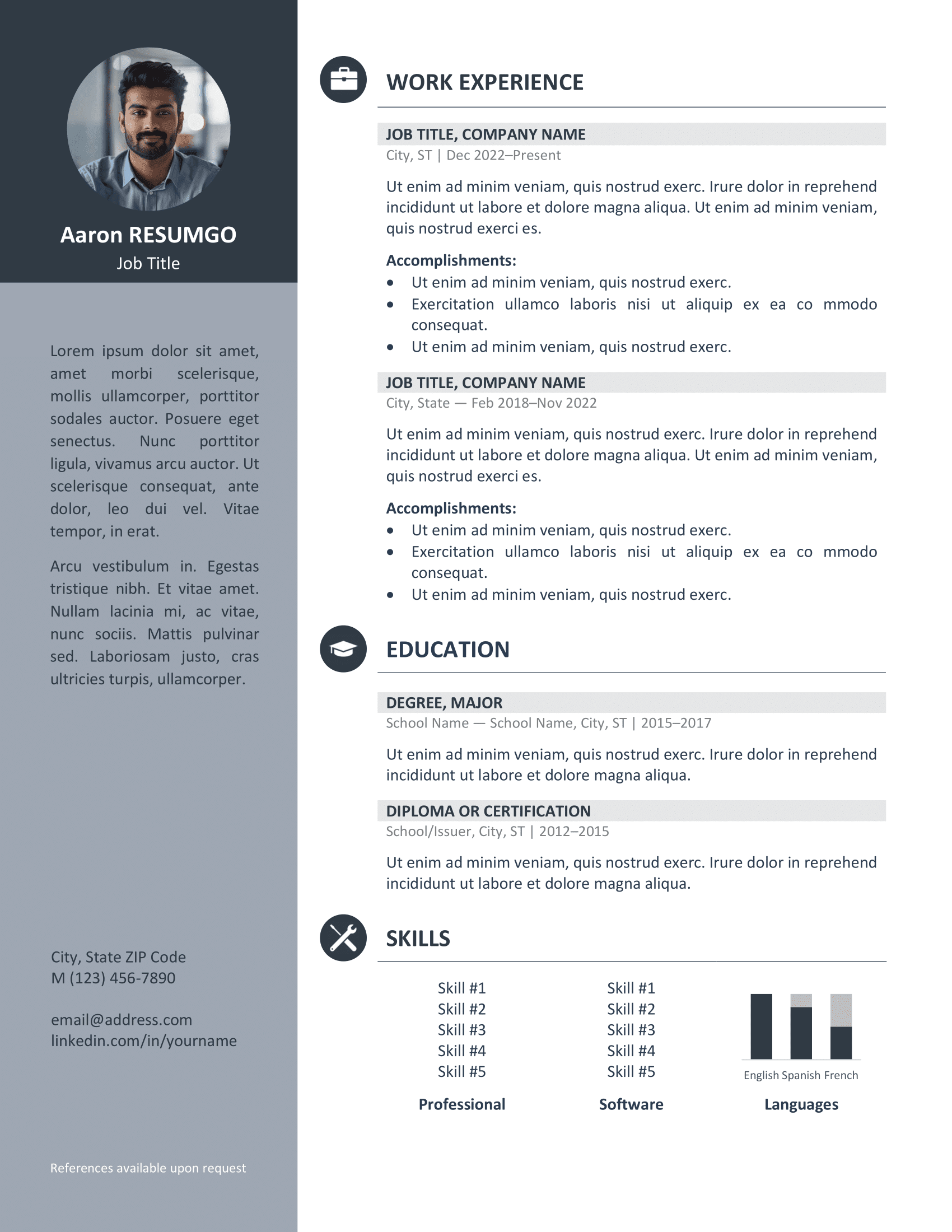 The Orienta resume template is a free professional CV that combines elegance and practicality. Featuring a clean two-column layout with a bold left sidebar, it balances modern design with excellent readability. Available in three color themes—blue, gray, and green—this template helps your application stand out while maintaining a polished look. Each version also includes a perfectly matching cover letter for a cohesive presentation.