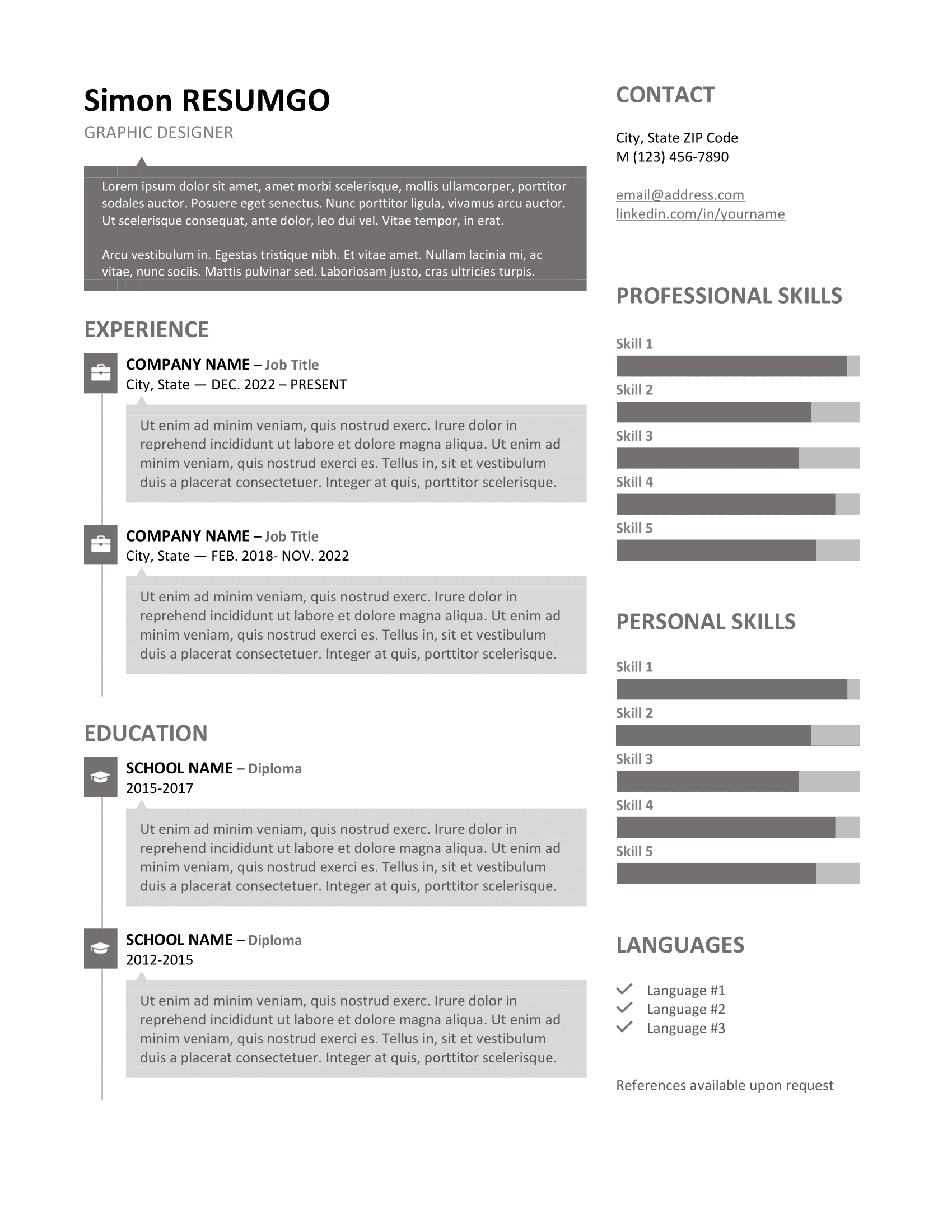 The SoHo resume template is a bold and creative design that uses speech bubbles to give your profile and career highlights a distinctive look. With its structured 2-column layout, your main content such as profile, experience, and education is displayed on the left, while your contact details, skills with bar charts, and languages are neatly organized on the right. This makes it both visually engaging and practical for recruiters.