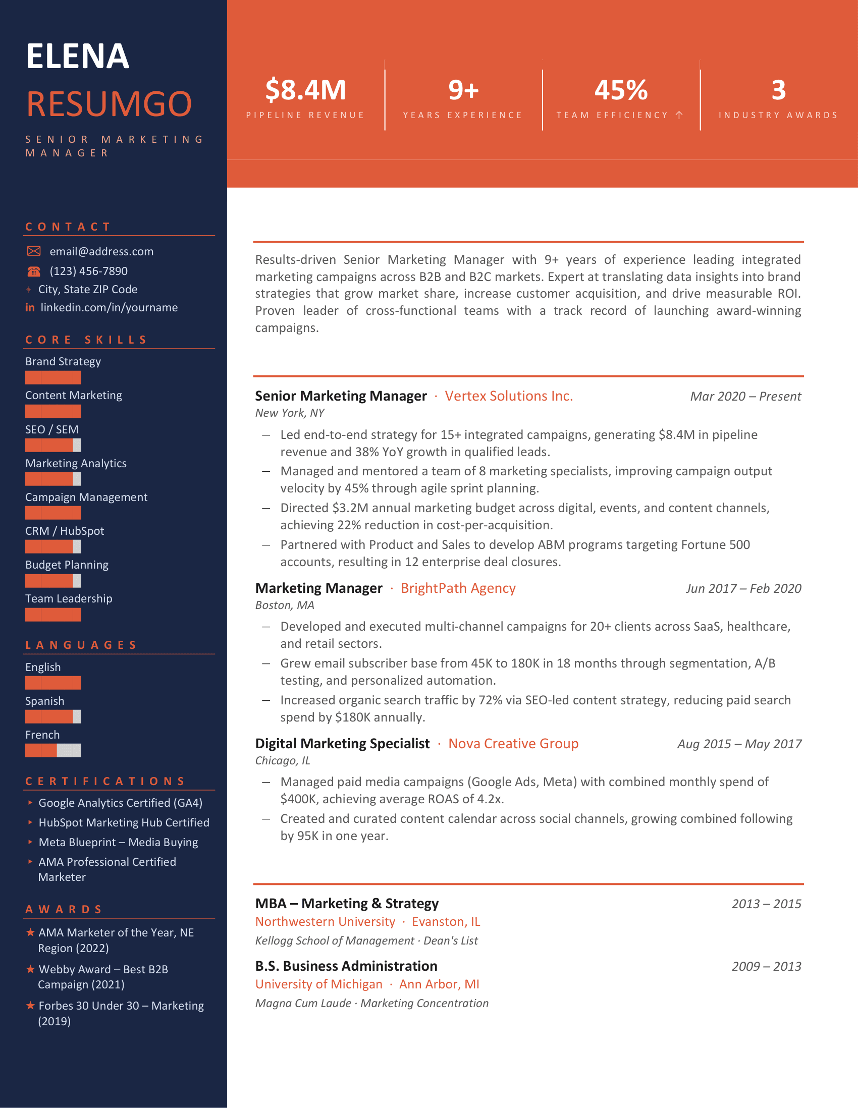This template is a strong choice for marketing professionals, business candidates, managers, consultants, and other applicants who want a resume that looks modern and achievement-focused. It is especially useful for people who want to emphasize results, performance, and career growth through a cleaner visual structure.