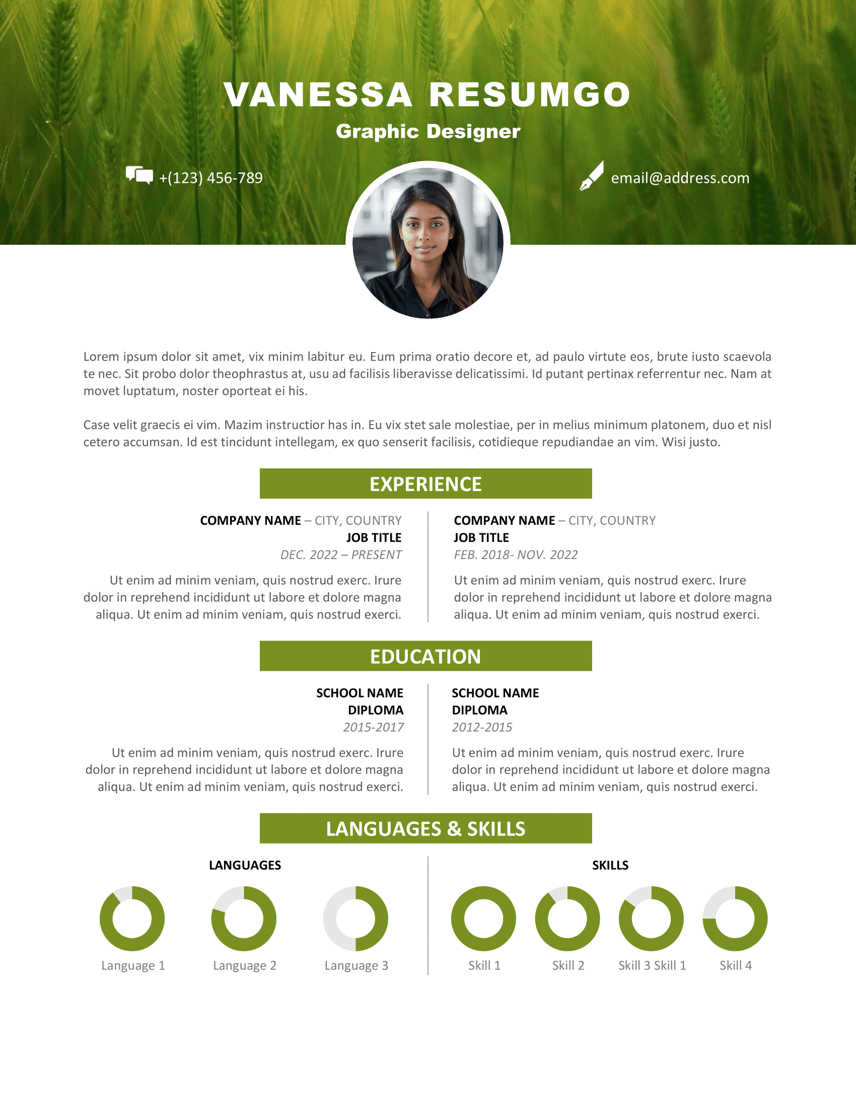 Vesterbro comes in three creative variants, each with a different banner theme: green barley fields, underwater scuba diving, and golden wheat fields. This gives you the flexibility to choose the version that best reflects your personality and professional field. The resume is designed for single or multiple pages, with the banner and optional ID photo featured on the first page.